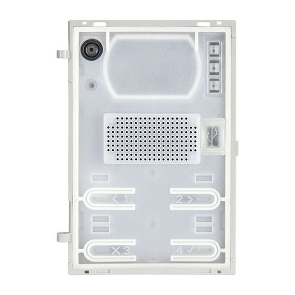 Due Fili Plus electronic unit for audio entrance panel, echo suppression, automatic sound balancing, automatic microphone level control, teleloop for hearing aids, 4 call buttons with white LED backlighting and dusk/dawn lighting control, call status indicator LED, 1 input for external camera, 1 input configurable as external button for CA door opener or PA door open, 1 direct opening output for electrical lock, to be completed with audio front cover and single, double or fixed button