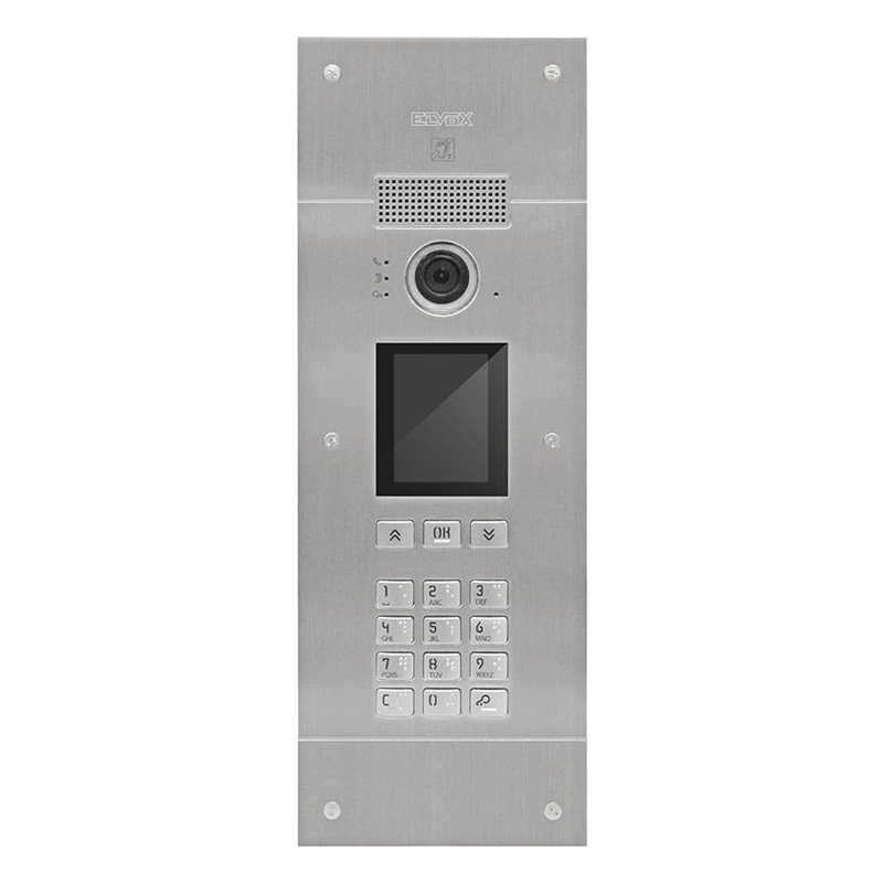 Colour video entrance panel with keypad, display and electronic contacts list, 6400 indoor stations, complete with metal flush mounting box, stainless steel